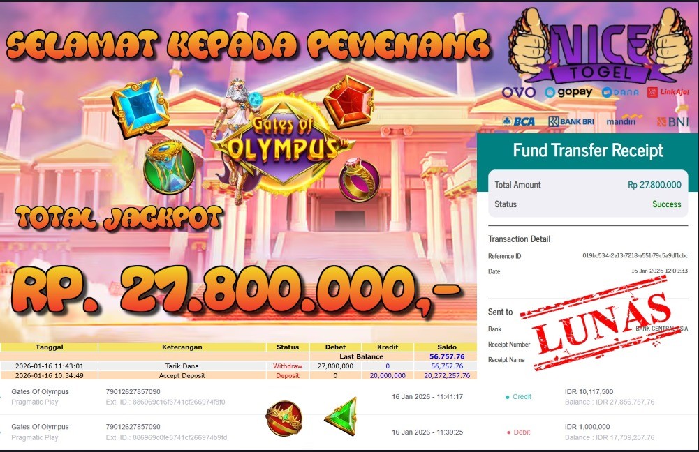 Selamat kepada User id : BABI**** Telah berhasil mendapatkan kemenangan besar pada permainan SLOT GATES OF OLYMPUS Dengan kemenangan Sebesar Rp 27.800.000,- Setelah mengisi formulir withdraw dengan kurung waktu hanya 5 – 10 menit pihak NICETOGEL sudah melakukan transfer kepada pemilik Userid dan dana sudah dapat di cairkan oleh pemenang. Bukti pembayaran yang kami berikan merupakan bukti pembayaran yang SAH / VALID yang langung di dapatkan melaui tanda transfer transaksi dari Bank yang di tuju.