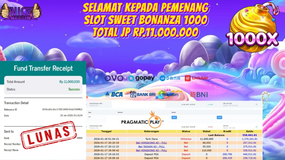 Selamat kepada User id : TATA**** Telah berhasil mendapatkan kemenangan besar pada permainan SLOT SWEET BONANZA 1000 Dengan kemenangan Sebesar Rp 11,000,000,- Setelah mengisi formulir withdraw dengan kurung waktu hanya 5 – 10 menit pihak NICETOGEL sudah melakukan transfer kepada pemilik Userid dan dana sudah dapat di cairkan oleh pemenang. Bukti pembayaran yang kami berikan merupakan bukti pembayaran yang SAH / VALID yang langung di dapatkan melaui tanda transfer transaksi dari Bank yang di tuju.