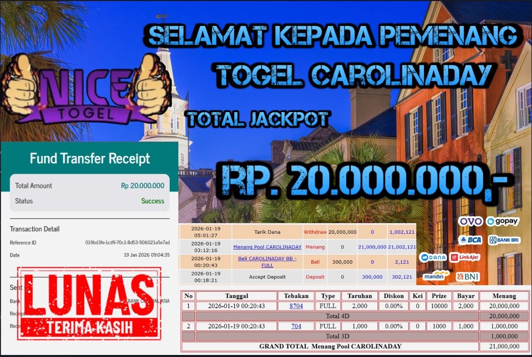 Selamat kepada User id : RID**** Telah berhasil mendapatkan kemenangan besar pada permainan TOGEL CAROLINADAYDengan kemenangan Sebesar Rp. 20.000.000,- Setelah mengisi formulir withdraw dengan kurung waktu hanya 5 – 10 menit pihak NICETOGEL sudah melakukan transfer kepada pemilik Userid dan dana sudah dapat di cairkan oleh pemenang. Bukti pembayaran yang kami berikan merupakan bukti pembayaran yang SAH / VALID yang langung di dapatkan melaui tanda transfer transaksi dari Bank yang di tuju.