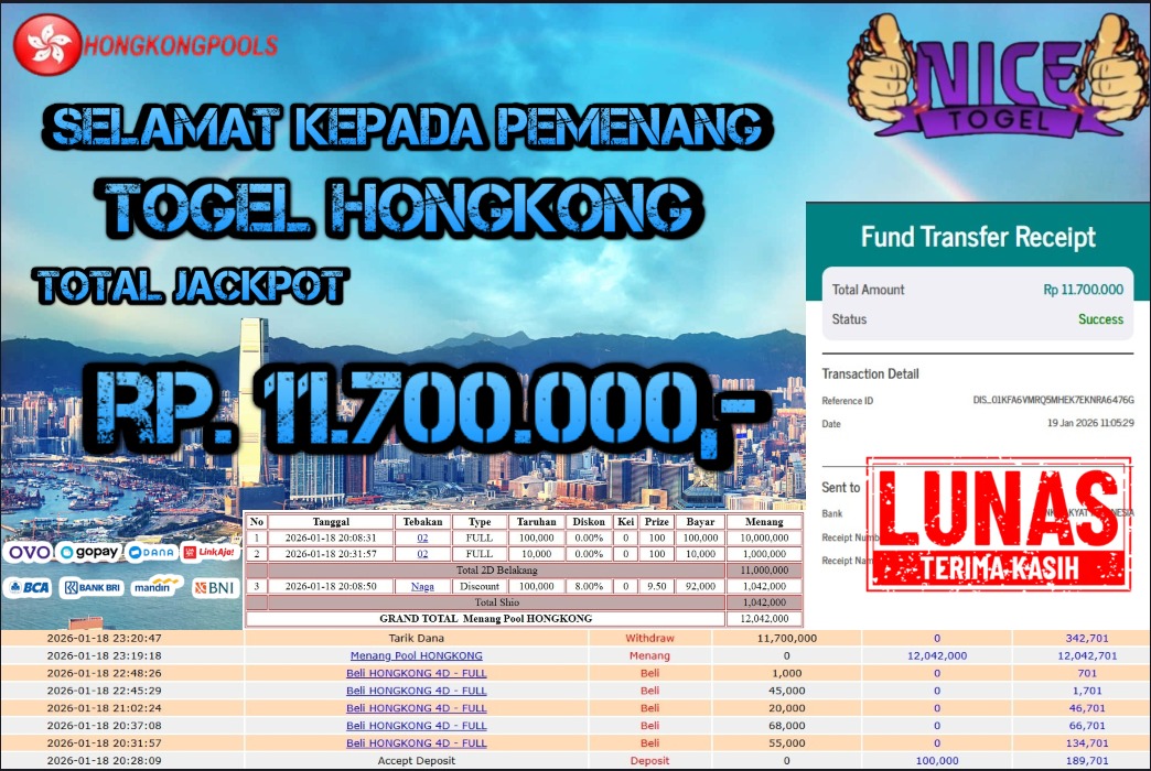 Selamat kepada User id : MAR**** Telah berhasil mendapatkan kemenangan besar pada permainan TOGEL HONGKONG Dengan kemenangan Sebesar Rp. 11.700.000,- Setelah mengisi formulir withdraw dengan kurung waktu hanya 5 – 10 menit pihak NICETOGEL sudah melakukan transfer kepada pemilik Userid dan dana sudah dapat di cairkan oleh pemenang. Bukti pembayaran yang kami berikan merupakan bukti pembayaran yang SAH / VALID yang langung di dapatkan melaui tanda transfer transaksi dari Bank yang di tuju.