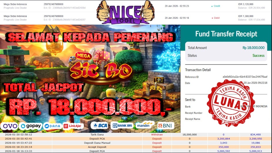 Selamat kepada User id : NUE**** Telah berhasil mendapatkan kemenangan besar pada permainan LIVE GAME MEGA SICBO Dengan kemenangan Sebesar Rp. 18.000.000- Setelah mengisi formulir withdraw dengan kurung waktu hanya 5 – 10 menit pihak NICETOGEL sudah melakukan transfer kepada pemilik Userid dan dana sudah dapat di cairkan oleh pemenang. Bukti pembayaran yang kami berikan merupakan bukti pembayaran yang SAH / VALID yang langung di dapatkan melaui tanda transfer transaksi dari Bank yang di tuju.