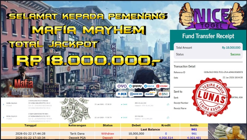 Selamat kepada User id : RAW**** Telah berhasil mendapatkan kemenangan besar pada permainan SLOT MAFIA MAYHEM Dengan kemenangan Sebesar Rp. 18.000.000- Setelah mengisi formulir withdraw dengan kurung waktu hanya 5 – 10 menit pihak NICETOGEL sudah melakukan transfer kepada pemilik Userid dan dana sudah dapat di cairkan oleh pemenang. Bukti pembayaran yang kami berikan merupakan bukti pembayaran yang SAH / VALID yang langung di dapatkan melaui tanda transfer transaksi dari Bank yang di tuju.