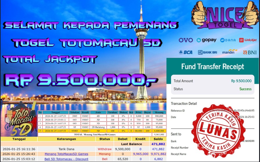 Selamat kepada User id : WAR**** Telah berhasil mendapatkan kemenangan besar pada permainan TOGEL TOTOMACAU 5D Dengan kemenangan Sebesar Rp. 9.500.000- Setelah mengisi formulir withdraw dengan kurung waktu hanya 5 – 10 menit pihak NICETOGEL sudah melakukan transfer kepada pemilik Userid dan dana sudah dapat di cairkan oleh pemenang. Bukti pembayaran yang kami berikan merupakan bukti pembayaran yang SAH / VALID yang langung di dapatkan melaui tanda transfer transaksi dari Bank yang di tuju.