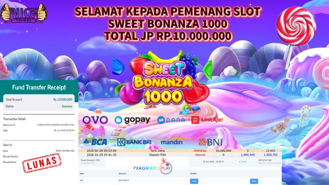 Selamat kepada User id : LALA**** Telah berhasil mendapatkan kemenangan besar pada permainan SLOT SWEET BONANZA 1000 Dengan kemenangan Sebesar Rp. 10.000.000- Setelah mengisi formulir withdraw dengan kurung waktu hanya 5 – 10 menit pihak NICETOGEL sudah melakukan transfer kepada pemilik Userid dan dana sudah dapat di cairkan oleh pemenang. Bukti pembayaran yang kami berikan merupakan bukti pembayaran yang SAH / VALID yang langung di dapatkan melaui tanda transfer transaksi dari Bank yang di tuju.