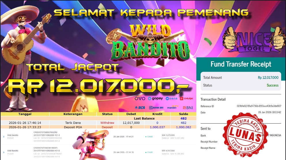 Selamat kepada User id : SIN**** Telah berhasil mendapatkan kemenangan besar pada permainan WILD BANDITO Dengan kemenangan Sebesar Rp. 12.017.000- Setelah mengisi formulir withdraw dengan kurung waktu hanya 5 – 10 menit pihak NICETOGEL sudah melakukan transfer kepada pemilik Userid dan dana sudah dapat di cairkan oleh pemenang. Bukti pembayaran yang kami berikan merupakan bukti pembayaran yang SAH / VALID yang langung di dapatkan melaui tanda transfer transaksi dari Bank yang di tuju.