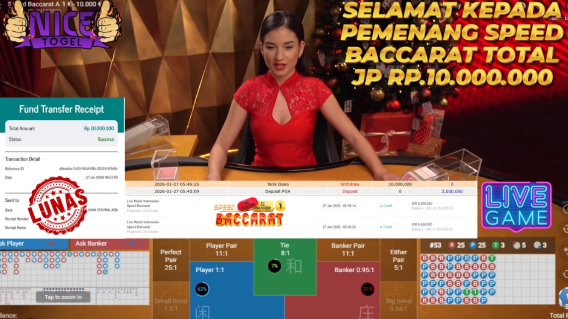 Selamat kepada User id : CACA**** Telah berhasil mendapatkan kemenangan besar pada permainan LIVE GAME SPEED BACCARAT Dengan kemenangan Sebesar Rp. 10.000.000- Setelah mengisi formulir withdraw dengan kurung waktu hanya 5 – 10 menit pihak NICETOGEL sudah melakukan transfer kepada pemilik Userid dan dana sudah dapat di cairkan oleh pemenang. Bukti pembayaran yang kami berikan merupakan bukti pembayaran yang SAH / VALID yang langung di dapatkan melaui tanda transfer transaksi dari Bank yang di tuju.