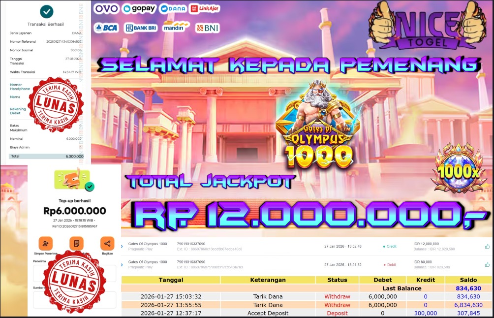 Selamat kepada User id : BAR**** Telah berhasil mendapatkan kemenangan besar pada permainan SLOT GATES OLYMPUS 1000  Dengan kemenangan Sebesar Rp. 12.000.000- Setelah mengisi formulir withdraw dengan kurung waktu hanya 5 – 10 menit pihak NICETOGEL sudah melakukan transfer kepada pemilik Userid dan dana sudah dapat di cairkan oleh pemenang. Bukti pembayaran yang kami berikan merupakan bukti pembayaran yang SAH / VALID yang langung di dapatkan melaui tanda transfer transaksi dari Bank yang di tuju.