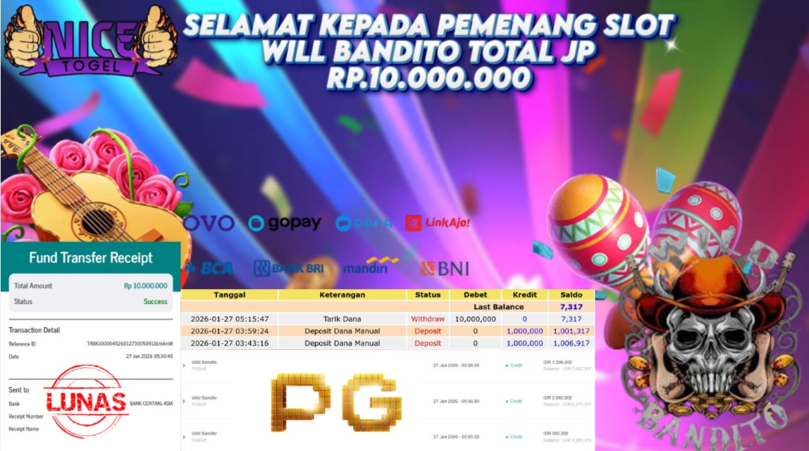 Selamat kepada User id : LALA**** Telah berhasil mendapatkan kemenangan besar pada permainan WILD BANDITO Dengan kemenangan Sebesar Rp. 10.000.000- Setelah mengisi formulir withdraw dengan kurung waktu hanya 5 – 10 menit pihak NICETOGEL sudah melakukan transfer kepada pemilik Userid dan dana sudah dapat di cairkan oleh pemenang. Bukti pembayaran yang kami berikan merupakan bukti pembayaran yang SAH / VALID yang langung di dapatkan melaui tanda transfer transaksi dari Bank yang di tuju.