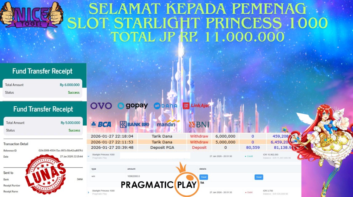 Selamat kepada User id : GAGA**** Telah berhasil mendapatkan kemenangan besar pada permainan SLOT STARLIGHT PRINCESS 1000 Dengan kemenangan Sebesar Rp. 11.000.000,- Setelah mengisi formulir withdraw dengan kurung waktu hanya 5 – 10 menit pihak NICETOGEL sudah melakukan transfer kepada pemilik Userid dan dana sudah dapat di cairkan oleh pemenang. Bukti pembayaran yang kami berikan merupakan bukti pembayaran yang SAH / VALID yang langung di dapatkan melaui tanda transfer transaksi dari Bank yang di tuju.