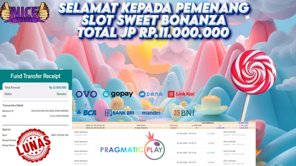 Selamat kepada User id : bab**** Telah berhasil mendapatkan kemenangan besar pada permainan SLOT SWEET BONANZA Dengan kemenangan Sebesar Rp. 11.000.000,- Setelah mengisi formulir withdraw dengan kurung waktu hanya 5 – 10 menit pihak NICETOGEL sudah melakukan transfer kepada pemilik Userid dan dana sudah dapat di cairkan oleh pemenang. Bukti pembayaran yang kami berikan merupakan bukti pembayaran yang SAH / VALID yang langung di dapatkan melaui tanda transfer transaksi dari Bank yang di tuju.