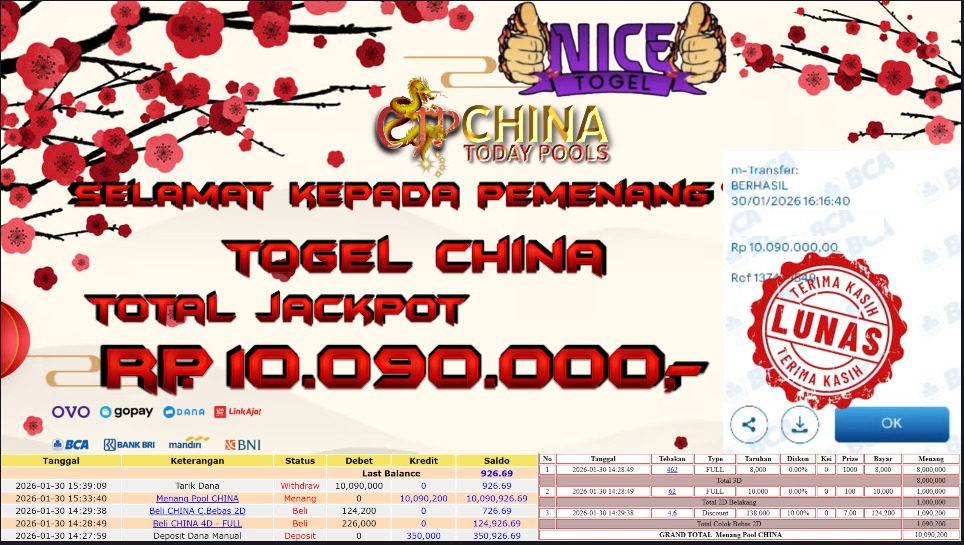 Selamat kepada User id : WAN**** Telah berhasil mendapatkan kemenangan besar pada permainan TOGEL CHINA   Dengan kemenangan Sebesar Rp. 10.090.000,- Setelah mengisi formulir withdraw dengan kurung waktu hanya 5 – 10 menit pihak NICETOGEL sudah melakukan transfer kepada pemilik Userid dan dana sudah dapat di cairkan oleh pemenang. Bukti pembayaran yang kami berikan merupakan bukti pembayaran yang SAH / VALID yang langung di dapatkan melaui tanda transfer transaksi dari Bank yang di tuju.