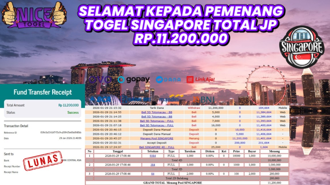 Selamat kepada User id : KIKI**** Telah berhasil mendapatkan kemenangan besar pada permainan TOGEL SINGAPORE   Dengan kemenangan Sebesar Rp. 11.200.000,- Setelah mengisi formulir withdraw dengan kurung waktu hanya 5 – 10 menit pihak NICETOGEL sudah melakukan transfer kepada pemilik Userid dan dana sudah dapat di cairkan oleh pemenang. Bukti pembayaran yang kami berikan merupakan bukti pembayaran yang SAH / VALID yang langung di dapatkan melaui tanda transfer transaksi dari Bank yang di tuju.