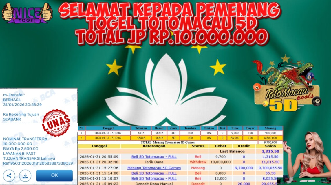 Selamat kepada User id : RARA**** Telah berhasil mendapatkan kemenangan besar pada permainan TOGEL TOTOMACAU 5D Dengan kemenangan Sebesar Rp. 10.000.000,- Setelah mengisi formulir withdraw dengan kurung waktu hanya 5 – 10 menit pihak NICETOGEL sudah melakukan transfer kepada pemilik Userid dan dana sudah dapat di cairkan oleh pemenang. Bukti pembayaran yang kami berikan merupakan bukti pembayaran yang SAH / VALID yang langung di dapatkan melaui tanda transfer transaksi dari Bank yang di tuju.