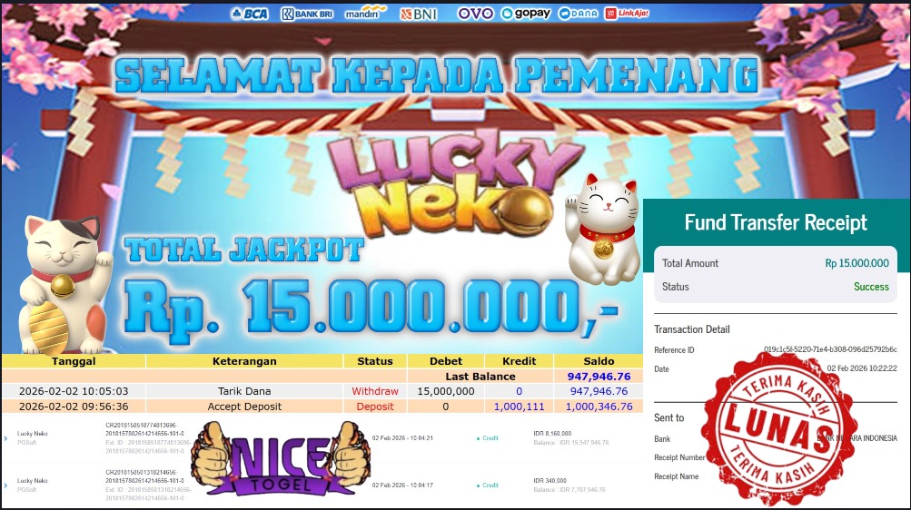 Selamat kepada User id : DEF**** Telah berhasil mendapatkan kemenangan besar pada permainan SLOT LUCKI NEKO  Dengan kemenangan Sebesar Rp. 15.000.000,- Setelah mengisi formulir withdraw dengan kurung waktu hanya 5 – 10 menit pihak NICETOGEL sudah melakukan transfer kepada pemilik Userid dan dana sudah dapat di cairkan oleh pemenang. Bukti pembayaran yang kami berikan merupakan bukti pembayaran yang SAH / VALID yang langung di dapatkan melaui tanda transfer transaksi dari Bank yang di tuju.
