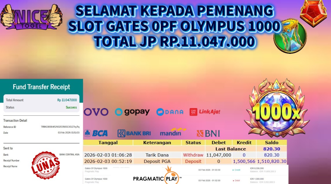 Selamat kepada User id : BABA**** Telah berhasil mendapatkan kemenangan besar pada permainan SLOT GATES OF OLYMPUS  Dengan kemenangan Sebesar Rp. 11.047.000,- Setelah mengisi formulir withdraw dengan kurung waktu hanya 5 – 10 menit pihak NICETOGEL sudah melakukan transfer kepada pemilik Userid dan dana sudah dapat di cairkan oleh pemenang. Bukti pembayaran yang kami berikan merupakan bukti pembayaran yang SAH / VALID yang langung di dapatkan melaui tanda transfer transaksi dari Bank yang di tuju.