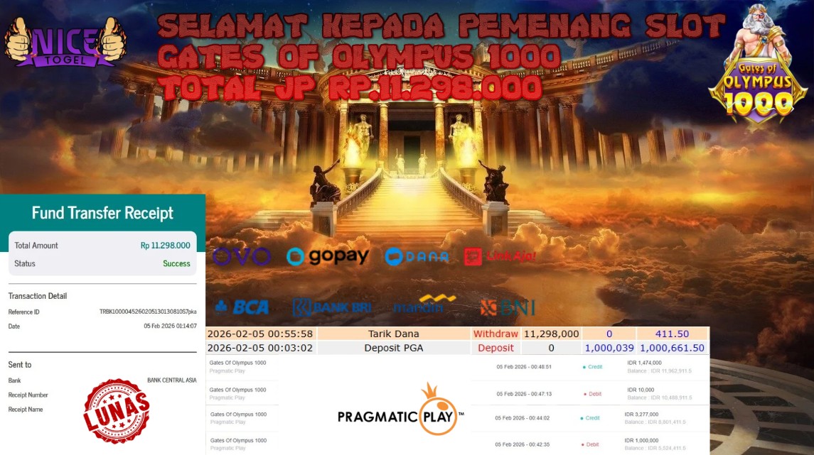Selamat kepada User id : KDGH**** Telah berhasil mendapatkan kemenangan besar pada permainan SLOT CURSE OF THE PYRAMID Dengan kemenangan Sebesar Rp. 11.298.000,- Setelah mengisi formulir withdraw dengan kurung waktu hanya 5 – 10 menit pihak NICETOGEL sudah melakukan transfer kepada pemilik Userid dan dana sudah dapat di cairkan oleh pemenang. Bukti pembayaran yang kami berikan merupakan bukti pembayaran yang SAH / VALID yang langung di dapatkan melaui tanda transfer transaksi dari Bank yang di tuju.