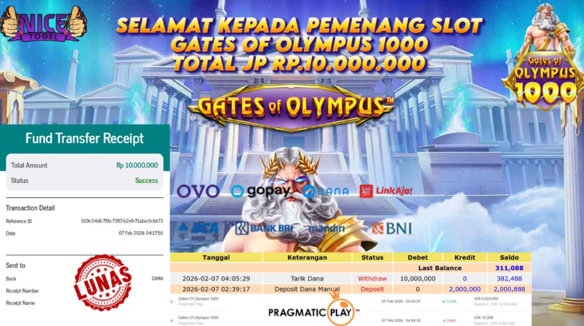 Selamat kepada User id : KSG**** Telah berhasil mendapatkan kemenangan besar pada permainan SLOT GATES OF OLYMPUS 1000 Dengan kemenangan Sebesar Rp. 10.000.000,- Setelah mengisi formulir withdraw dengan kurung waktu hanya 5 – 10 menit pihak NICETOGEL sudah melakukan transfer kepada pemilik Userid dan dana sudah dapat di cairkan oleh pemenang. Bukti pembayaran yang kami berikan merupakan bukti pembayaran yang SAH / VALID yang langung di dapatkan melaui tanda transfer transaksi dari Bank yang di tuju.