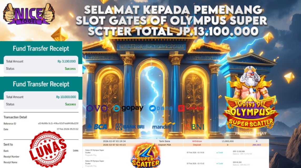 Selamat kepada User id : KDSF**** Telah berhasil mendapatkan kemenangan besar pada permainan SLOT GATES OF OLYMPUS SUPER SCTTER Dengan kemenangan Sebesar Rp. 13,100,000,- Setelah mengisi formulir withdraw dengan kurung waktu hanya 5 – 10 menit pihak NICETOGEL sudah melakukan transfer kepada pemilik Userid dan dana sudah dapat di cairkan oleh pemenang. Bukti pembayaran yang kami berikan merupakan bukti pembayaran yang SAH / VALID yang langung di dapatkan melaui tanda transfer transaksi dari Bank yang di tuju.