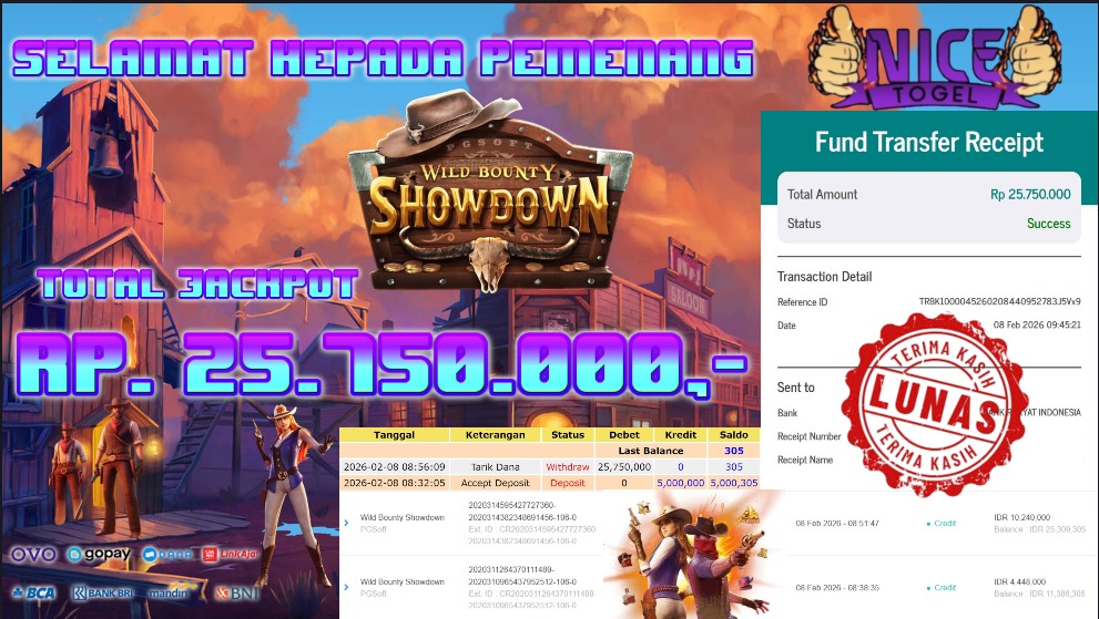Selamat kepada User id : DEP**** Telah berhasil mendapatkan kemenangan besar pada permainan SLOT WILD BOUNTY SHOWDOWN Dengan kemenangan Sebesar Rp. 25.750.000,- Setelah mengisi formulir withdraw dengan kurung waktu hanya 5 – 10 menit pihak NICETOGEL sudah melakukan transfer kepada pemilik Userid dan dana sudah dapat di cairkan oleh pemenang. Bukti pembayaran yang kami berikan merupakan bukti pembayaran yang SAH / VALID yang langung di dapatkan melaui tanda transfer transaksi dari Bank yang di tuju.