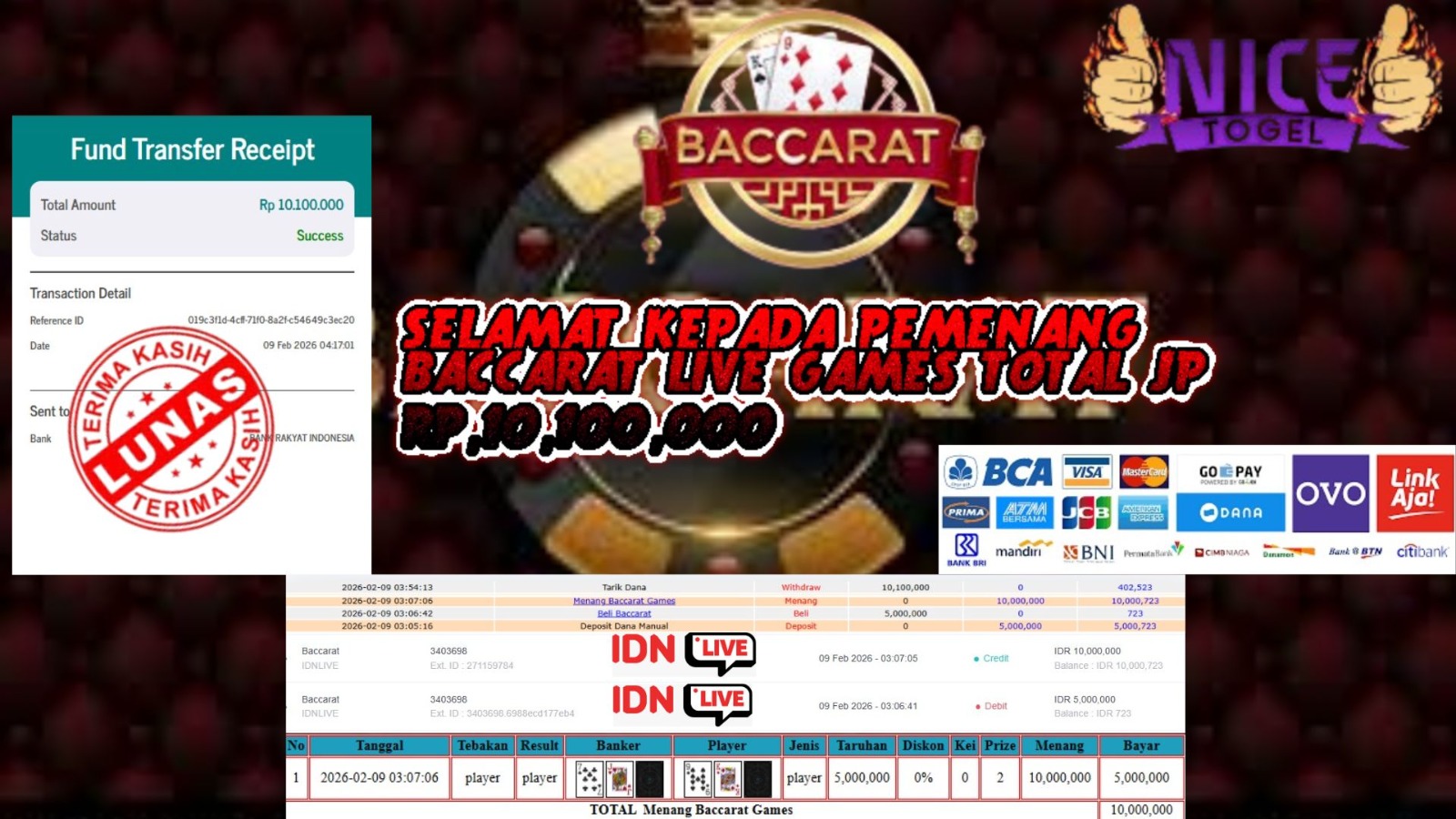 Selamat kepada User id : DEP**** Telah berhasil mendapatkan kemenangan besar pada permainan LIVE GAMES BACCARAT Dengan kemenangan Sebesar Rp. 10.100.000,- Setelah mengisi formulir withdraw dengan kurung waktu hanya 5 – 10 menit pihak NICETOGEL sudah melakukan transfer kepada pemilik Userid dan dana sudah dapat di cairkan oleh pemenang. Bukti pembayaran yang kami berikan merupakan bukti pembayaran yang SAH / VALID yang langung di dapatkan melaui tanda transfer transaksi dari Bank yang di tuju.