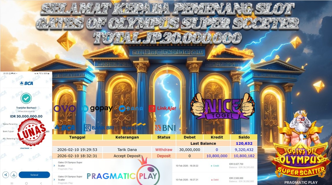 Selamat kepada User id : SGDGBD**** Telah berhasil mendapatkan kemenangan besar pada permainan SLOT GATES OF OLYMPUS SUPER SCCTER  Dengan kemenangan Sebesar Rp. 10.000.000,- Setelah mengisi formulir withdraw dengan kurung waktu hanya 5 – 10 menit pihak NICETOGEL sudah melakukan transfer kepada pemilik Userid dan dana sudah dapat di cairkan oleh pemenang. Bukti pembayaran yang kami berikan merupakan bukti pembayaran yang SAH / VALID yang langung di dapatkan melaui tanda transfer transaksi dari Bank yang di tuju.