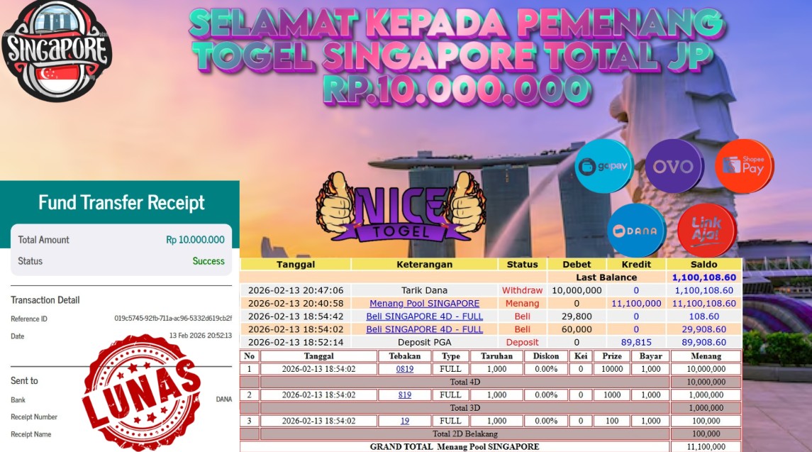 Selamat kepada User id : MDD**** Telah berhasil mendapatkan kemenangan besar pada permainan TOGEL SINGAPORE Dengan kemenangan Sebesar Rp. 10.000.000,- Setelah mengisi formulir withdraw dengan kurung waktu hanya 5 – 10 menit pihak NICETOGEL sudah melakukan transfer kepada pemilik Userid dan dana sudah dapat di cairkan oleh pemenang. Bukti pembayaran yang kami berikan merupakan bukti pembayaran yang SAH / VALID yang langung di dapatkan melaui tanda transfer transaksi dari Bank yang di tuju.
