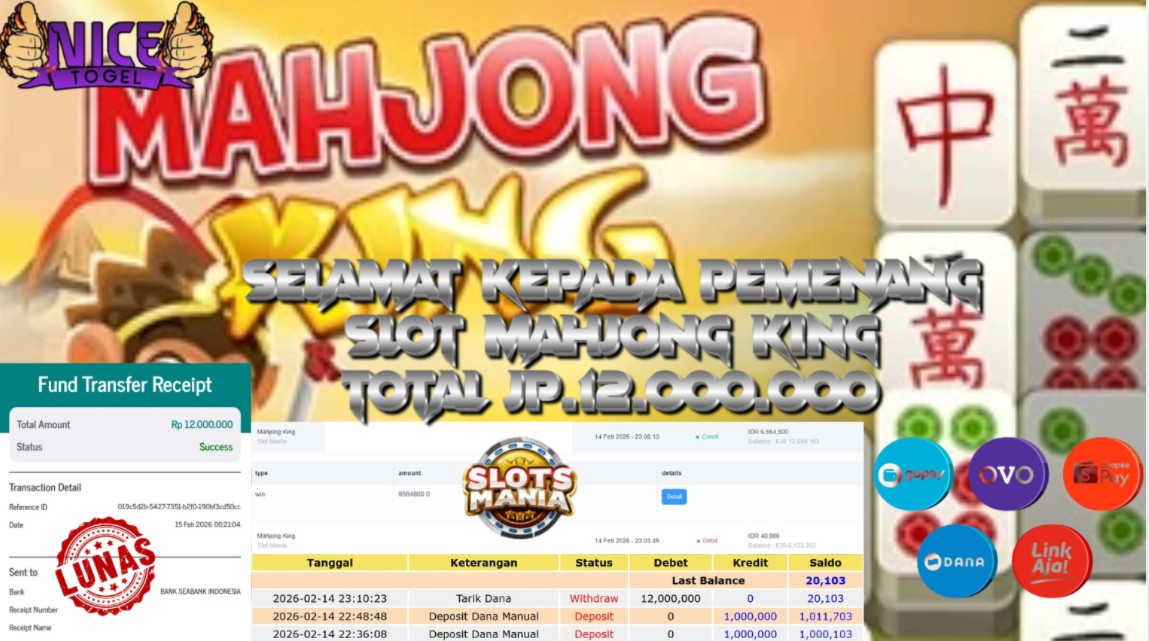 Selamat kepada User id : SFGF**** Telah berhasil mendapatkan kemenangan besar pada permainan SLOT MANHJONG KING Dengan kemenangan Sebesar Rp. 12.000.000,- Setelah mengisi formulir withdraw dengan kurung waktu hanya 5 – 10 menit pihak NICETOGEL sudah melakukan transfer kepada pemilik Userid dan dana sudah dapat di cairkan oleh pemenang. Bukti pembayaran yang kami berikan merupakan bukti pembayaran yang SAH / VALID yang langung di dapatkan melaui tanda transfer transaksi dari Bank yang di tuju.