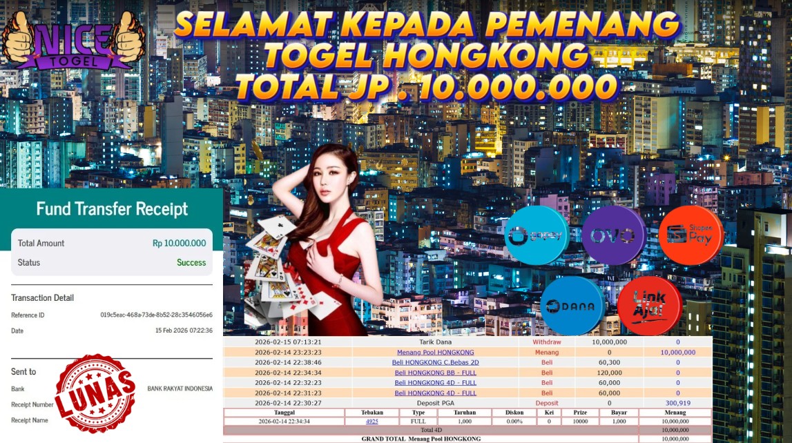 Selamat kepada User id : DHFVGF**** Telah berhasil mendapatkan kemenangan besar pada permainan TOGEL HONGKONG Dengan kemenangan Sebesar Rp. 10.000.000,- Setelah mengisi formulir withdraw dengan kurung waktu hanya 5 – 10 menit pihak NICETOGEL sudah melakukan transfer kepada pemilik Userid dan dana sudah dapat di cairkan oleh pemenang. Bukti pembayaran yang kami berikan merupakan bukti pembayaran yang SAH / VALID yang langung di dapatkan melaui tanda transfer transaksi dari Bank yang di tuju.