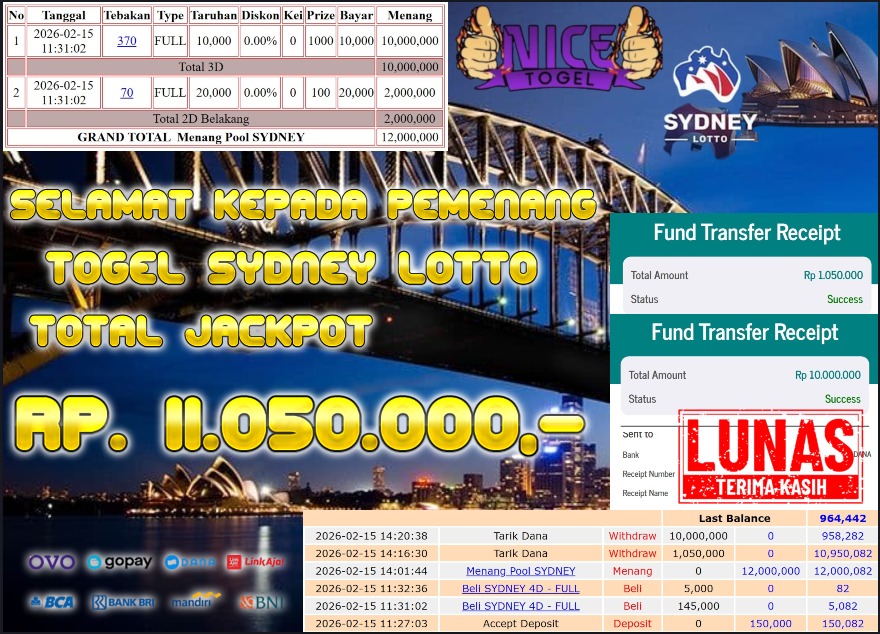 Selamat kepada User id : RID**** Telah berhasil mendapatkan kemenangan besar pada permainan TOGEL SYDNEY LOTTO Dengan kemenangan Sebesar Rp. 11.050.000,- Setelah mengisi formulir withdraw dengan kurung waktu hanya 5 – 10 menit pihak NICETOGEL sudah melakukan transfer kepada pemilik Userid dan dana sudah dapat di cairkan oleh pemenang. Bukti pembayaran yang kami berikan merupakan bukti pembayaran yang SAH / VALID yang langung di dapatkan melaui tanda transfer transaksi dari Bank yang di tuju.