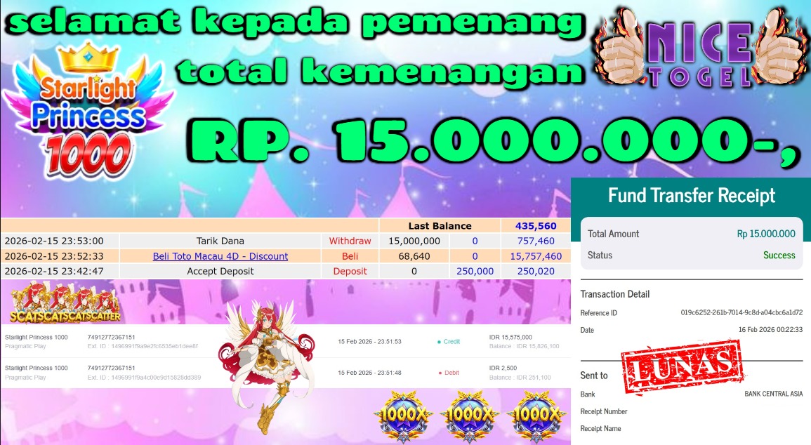 Selamat kepada User id : WAR**** Telah berhasil mendapatkan kemenangan besar pada permainan SLOT STARLIGHT PRINCESS 1000 Dengan kemenangan Sebesar Rp. 15.000.000,- Setelah mengisi formulir withdraw dengan kurung waktu hanya 5 – 10 menit pihak NICETOGEL sudah melakukan transfer kepada pemilik Userid dan dana sudah dapat di cairkan oleh pemenang. Bukti pembayaran yang kami berikan merupakan bukti pembayaran yang SAH / VALID yang langung di dapatkan melaui tanda transfer transaksi dari Bank yang di tuju.