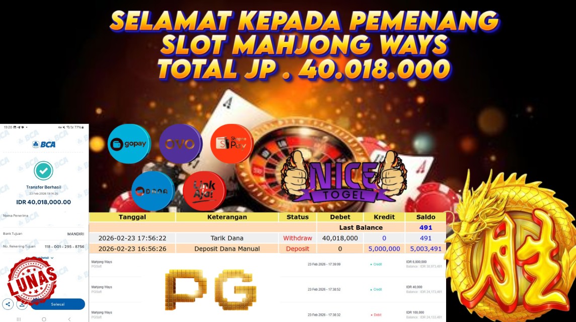 Selamat kepada User id : NDGF**** Telah berhasil mendapatkan kemenangan besar pada permainan SLOT MAHJONG WAYS Dengan kemenangan Sebesar Rp. 40.018.000,- Setelah mengisi formulir withdraw dengan kurung waktu hanya 5 – 10 menit pihak NICETOGEL sudah melakukan transfer kepada pemilik Userid dan dana sudah dapat di cairkan oleh pemenang. Bukti pembayaran yang kami berikan merupakan bukti pembayaran yang SAH / VALID yang langung di dapatkan melaui tanda transfer transaksi dari Bank yang di tuju.