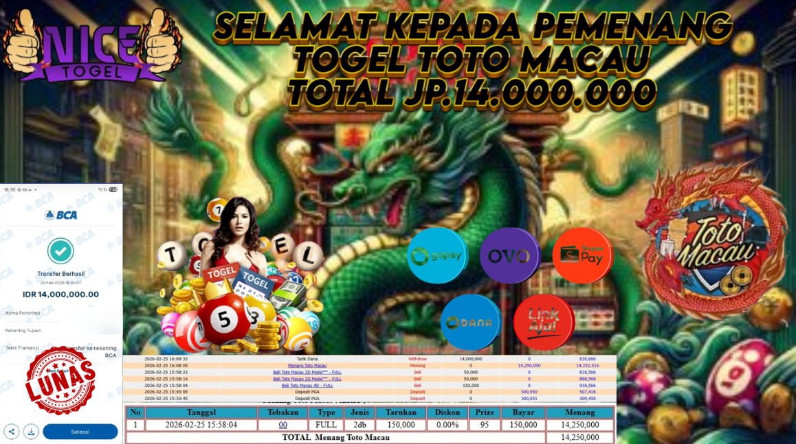 Selamat kepada User id : BSGS**** Telah berhasil mendapatkan kemenangan besar pada permainan TOGEL TOTOMACAU Dengan kemenangan Sebesar Rp. 14.000.000,- Setelah mengisi formulir withdraw dengan kurung waktu hanya 5 – 10 menit pihak NICETOGEL sudah melakukan transfer kepada pemilik Userid dan dana sudah dapat di cairkan oleh pemenang. Bukti pembayaran yang kami berikan merupakan bukti pembayaran yang SAH / VALID yang langung di dapatkan melaui tanda transfer transaksi dari Bank yang di tuju.