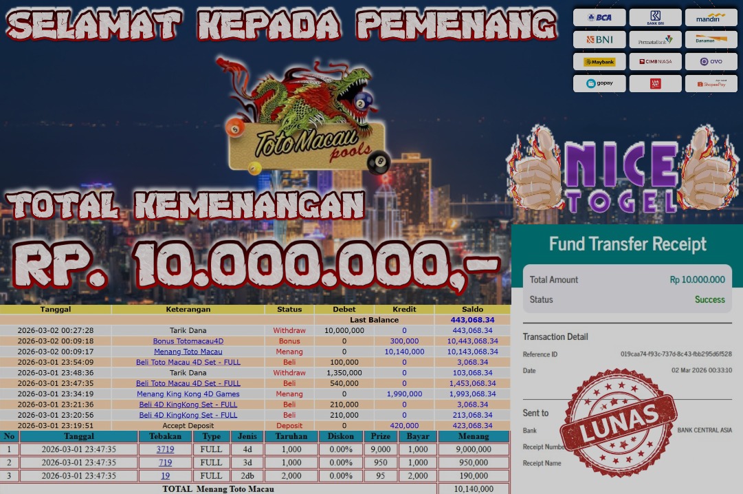 Selamat kepada User id : DOM**** Telah berhasil mendapatkan kemenangan besar pada permainan TOGEL TOTO MACAU Dengan kemenangan Sebesar Rp. 10.000.000,- Setelah mengisi formulir withdraw dengan kurung waktu hanya 5 – 10 menit pihak NICETOGEL sudah melakukan transfer kepada pemilik Userid dan dana sudah dapat di cairkan oleh pemenang. Bukti pembayaran yang kami berikan merupakan bukti pembayaran yang SAH / VALID yang langung di dapatkan melaui tanda transfer transaksi dari Bank yang di tuju.