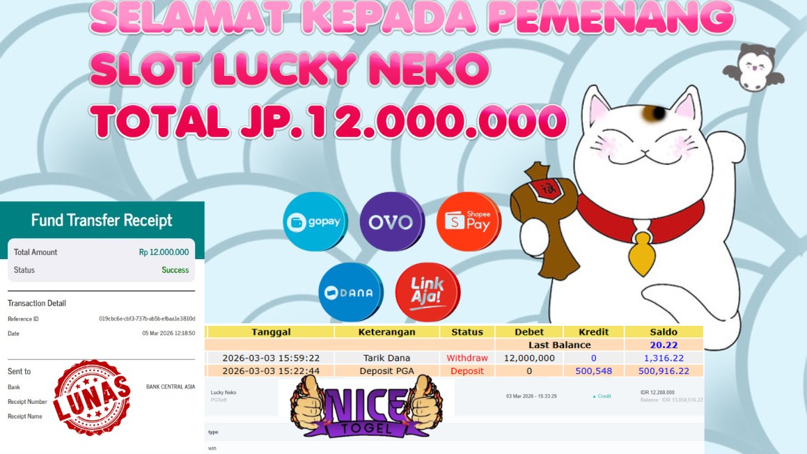 Selamat kepada User id : BS**** Telah berhasil mendapatkan kemenangan besar pada permainan SLOT LUCKY NEKO   Dengan kemenangan Sebesar Rp. 12.000.000,- Setelah mengisi formulir withdraw dengan kurung waktu hanya 5 – 10 menit pihak NICETOGEL sudah melakukan transfer kepada pemilik Userid dan dana sudah dapat di cairkan oleh pemenang. Bukti pembayaran yang kami berikan merupakan bukti pembayaran yang SAH / VALID yang langung di dapatkan melaui tanda transfer transaksi dari Bank yang di tuju.