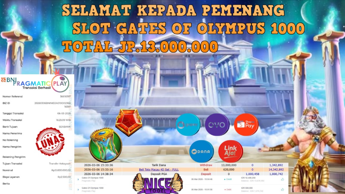 Selamat kepada User id : MFHFG**** Telah berhasil mendapatkan kemenangan besar pada permainan SLOT GATES OF OLYMPUS 1000 Dengan kemenangan Sebesar Rp. 13.000.000,- Setelah mengisi formulir withdraw dengan kurung waktu hanya 5 – 10 menit pihak NICETOGEL sudah melakukan transfer kepada pemilik Userid dan dana sudah dapat di cairkan oleh pemenang. Bukti pembayaran yang kami berikan merupakan bukti pembayaran yang SAH / VALID yang langung di dapatkan melaui tanda transfer transaksi dari Bank yang di tuju.