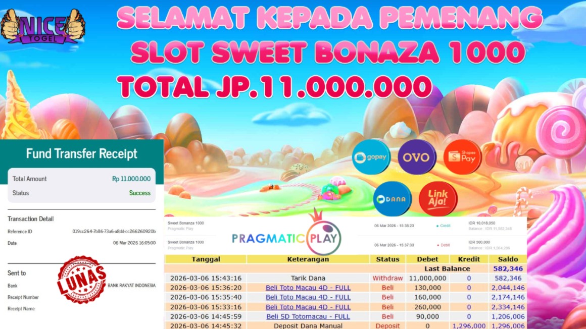 Selamat kepada User id : VFF**** Telah berhasil mendapatkan kemenangan besar pada permainan SLOT SWEET BONANZA 1000  Dengan kemenangan Sebesar Rp. 11.000.000,- Setelah mengisi formulir withdraw dengan kurung waktu hanya 5 – 10 menit pihak NICETOGEL sudah melakukan transfer kepada pemilik Userid dan dana sudah dapat di cairkan oleh pemenang. Bukti pembayaran yang kami berikan merupakan bukti pembayaran yang SAH / VALID yang langung di dapatkan melaui tanda transfer transaksi dari Bank yang di tuju.