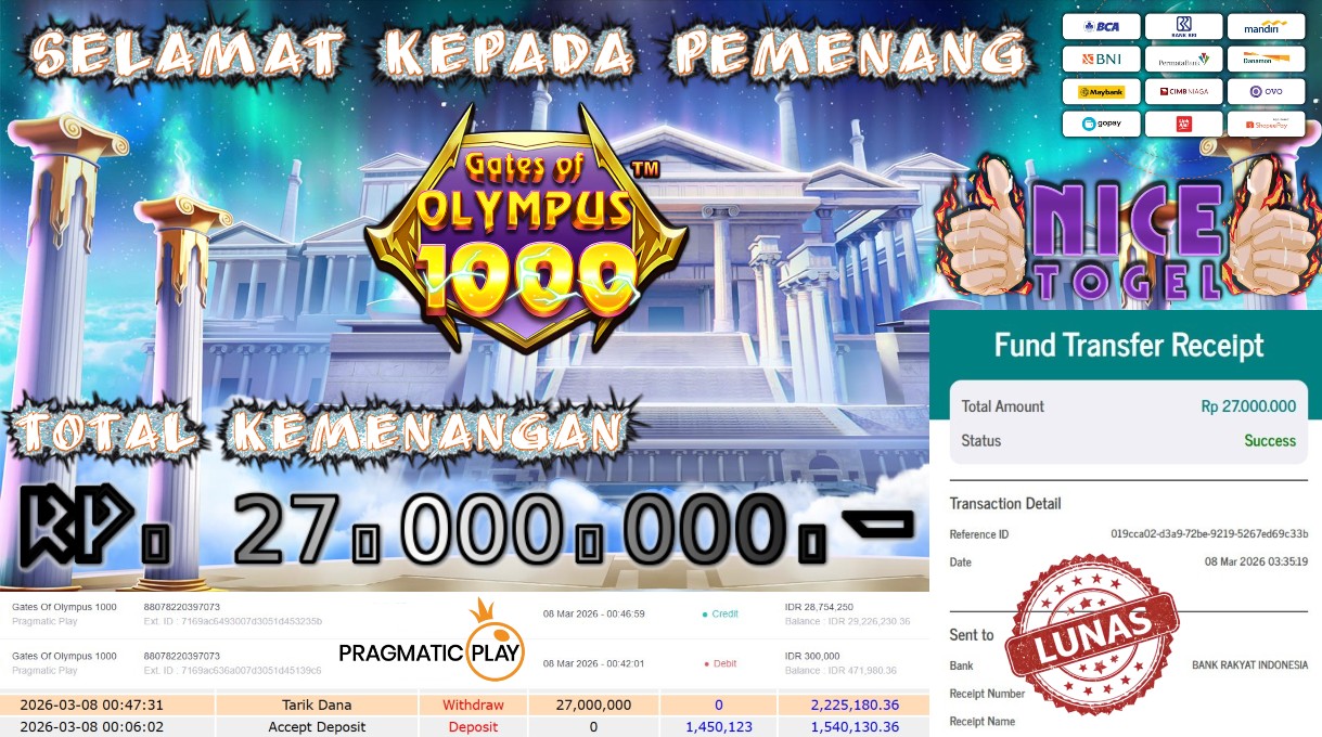 Selamat kepada User id : BNA**** Telah berhasil mendapatkan kemenangan besar pada permainan SLOT GATES OF OLYMPUS 1000 Dengan kemenangan Sebesar Rp. 27.000.000,- Setelah mengisi formulir withdraw dengan kurung waktu hanya 5 – 10 menit pihak NICETOGEL sudah melakukan transfer kepada pemilik Userid dan dana sudah dapat di cairkan oleh pemenang. Bukti pembayaran yang kami berikan merupakan bukti pembayaran yang SAH / VALID yang langung di dapatkan melaui tanda transfer transaksi dari Bank yang di tuju.