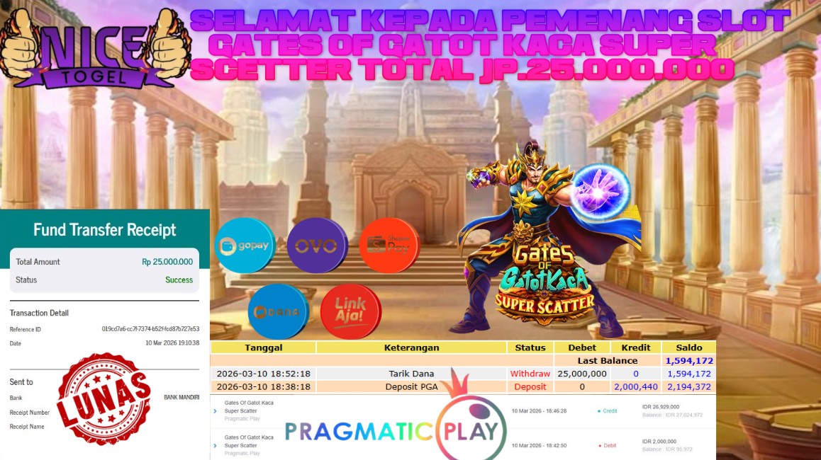 Selamat kepada User id : BDG**** Telah berhasil mendapatkan kemenangan besar pada permainan SLOT GATES OF GATOT KACA SUPER SCATTER Dengan kemenangan Sebesar Rp. 25.000.000,- Setelah mengisi formulir withdraw dengan kurung waktu hanya 5 – 10 menit pihak NICETOGEL sudah melakukan transfer kepada pemilik Userid dan dana sudah dapat di cairkan oleh pemenang. Bukti pembayaran yang kami berikan merupakan bukti pembayaran yang SAH / VALID yang langung di dapatkan melaui tanda transfer transaksi dari Bank yang di tuju.