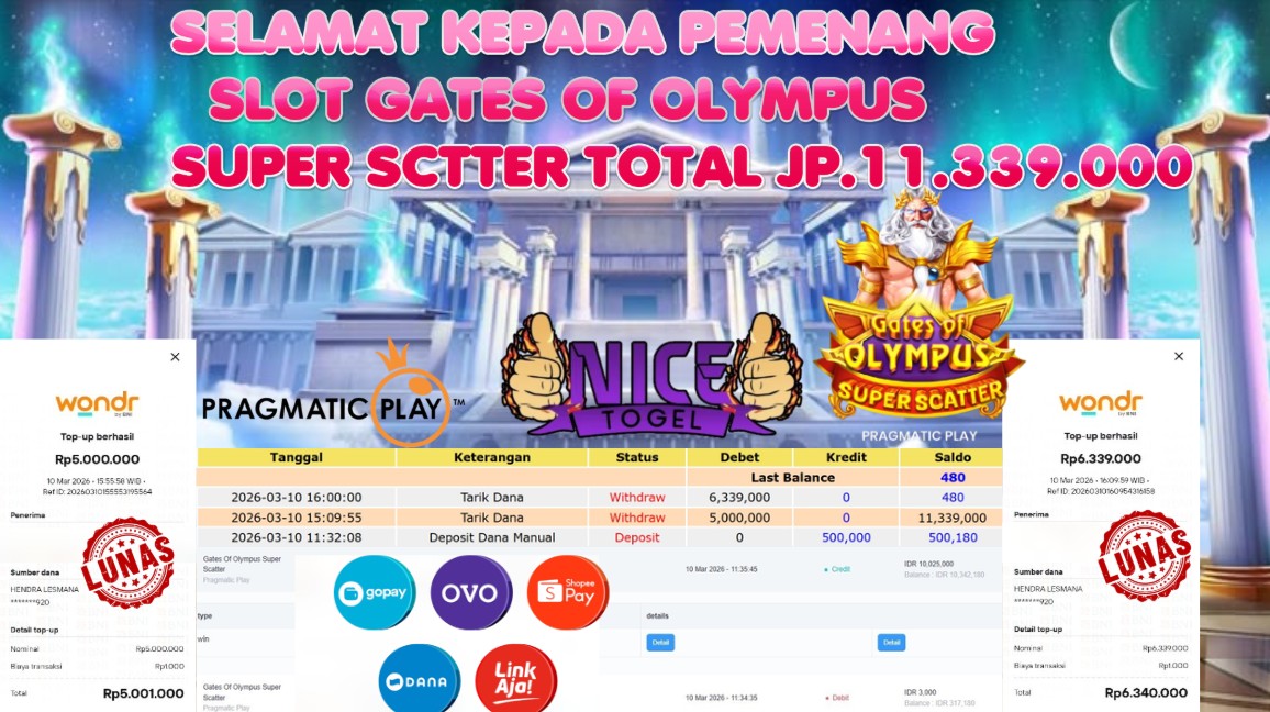 Selamat kepada User id : MGJ**** Telah berhasil mendapatkan kemenangan besar pada permainan SLOT GATES OF OLYMPUS SUPER SCTTER Dengan kemenangan Sebesar Rp. 11.339.000,- Setelah mengisi formulir withdraw dengan kurung waktu hanya 5 – 10 menit pihak NICETOGEL sudah melakukan transfer kepada pemilik Userid dan dana sudah dapat di cairkan oleh pemenang. Bukti pembayaran yang kami berikan merupakan bukti pembayaran yang SAH / VALID yang langung di dapatkan melaui tanda transfer transaksi dari Bank yang di tuju.