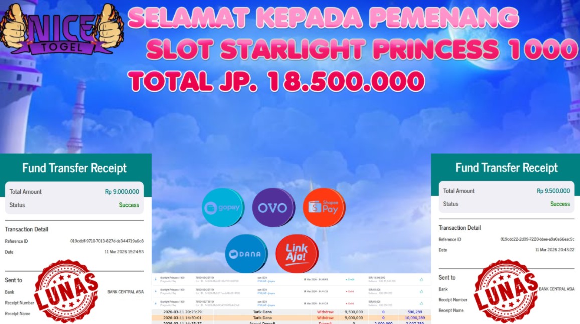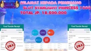 Selamat kepada User id : SDHD**** Telah berhasil mendapatkan kemenangan besar pada permainan SLOT STARLIGH PRINCESS 1000  Dengan kemenangan Sebesar Rp. 18.500.000,- Setelah mengisi formulir withdraw dengan kurung waktu hanya 5 – 10 menit pihak NICETOGEL sudah melakukan transfer kepada pemilik Userid dan dana sudah dapat di cairkan oleh pemenang. Bukti pembayaran yang kami berikan merupakan bukti pembayaran yang SAH / VALID yang langung di dapatkan melaui tanda transfer transaksi dari Bank yang di tuju.