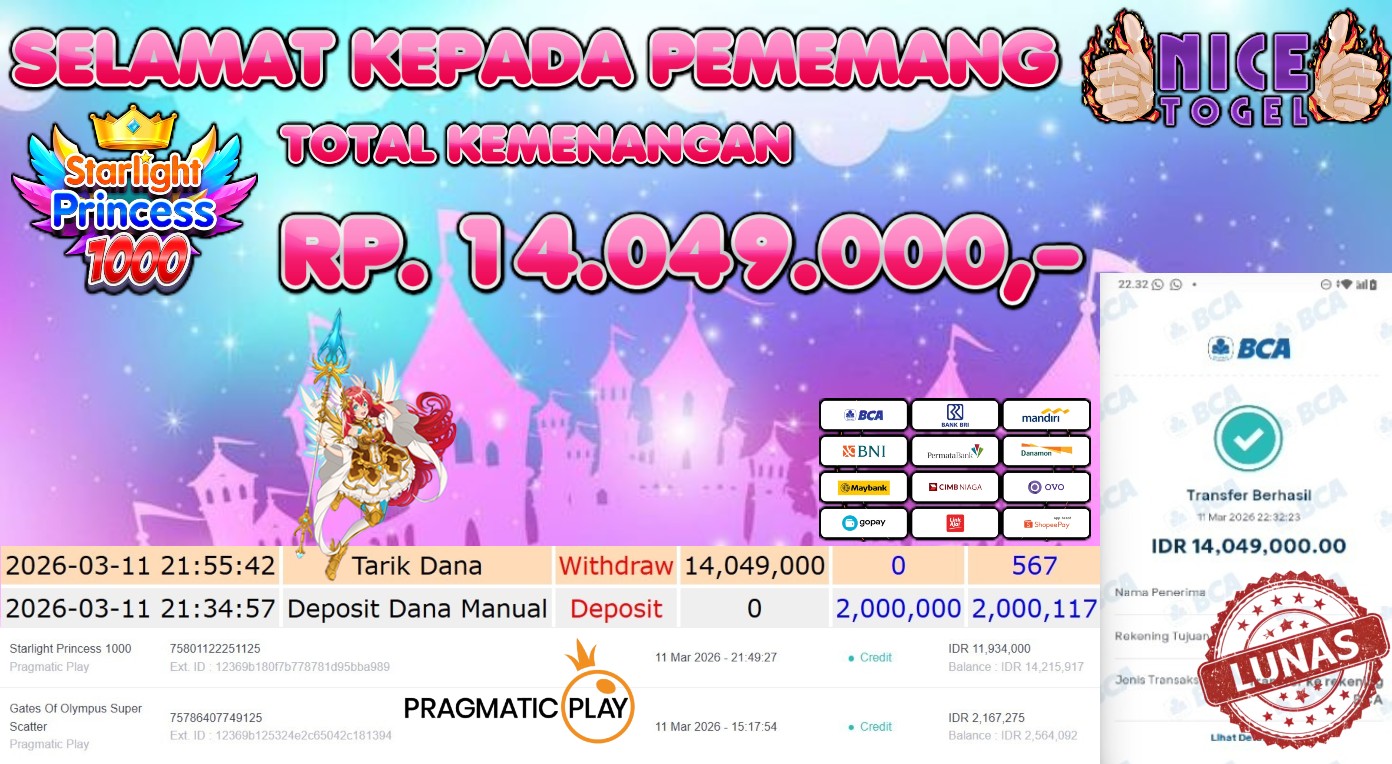 Selamat kepada User id : JE**** Telah berhasil mendapatkan kemenangan besar pada permainan SLOT STARLIGHT PRINCESS 1000 Dengan kemenangan Sebesar Rp. 14.049.000,- Setelah mengisi formulir withdraw dengan kurung waktu hanya 5 – 10 menit pihak NICETOGEL sudah melakukan transfer kepada pemilik Userid dan dana sudah dapat di cairkan oleh pemenang. Bukti pembayaran yang kami berikan merupakan bukti pembayaran yang SAH / VALID yang langung di dapatkan melaui tanda transfer transaksi dari Bank yang di tuju.