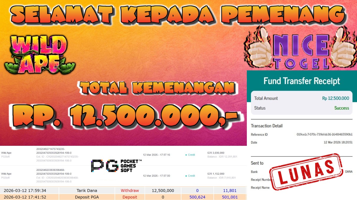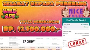 Selamat kepada User id : SRY**** Telah berhasil mendapatkan kemenangan besar pada permainan SLOT WILD APE   Dengan kemenangan Sebesar Rp. 12.500.000,- Setelah mengisi formulir withdraw dengan kurung waktu hanya 5 – 10 menit pihak NICETOGEL sudah melakukan transfer kepada pemilik Userid dan dana sudah dapat di cairkan oleh pemenang. Bukti pembayaran yang kami berikan merupakan bukti pembayaran yang SAH / VALID yang langung di dapatkan melaui tanda transfer transaksi dari Bank yang di tuju.