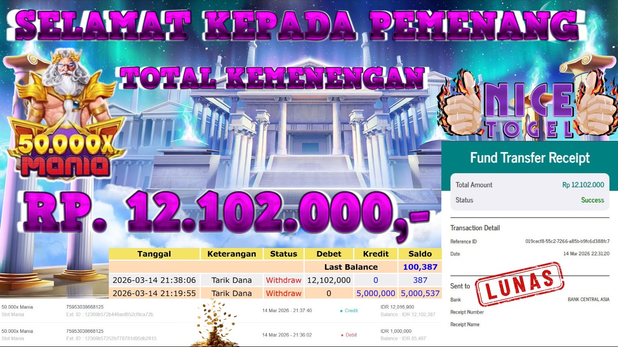 Selamat kepada User id : KAL**** Telah berhasil mendapatkan kemenangan besar pada permainan SLOT 50.000 X MANIA Dengan kemenangan Sebesar Rp. 12.102.000,- Setelah mengisi formulir withdraw dengan kurung waktu hanya 5 – 10 menit pihak NICETOGEL sudah melakukan transfer kepada pemilik Userid dan dana sudah dapat di cairkan oleh pemenang. Bukti pembayaran yang kami berikan merupakan bukti pembayaran yang SAH / VALID yang langung di dapatkan melaui tanda transfer transaksi dari Bank yang di tuju.