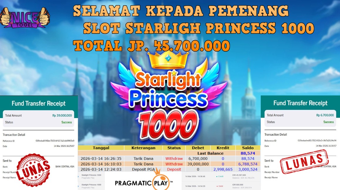Selamat kepada User id : WEL**** Telah berhasil mendapatkan kemenangan besar pada permainan SLOT STARLIGHT PRINCESS 1000 Dengan kemenangan Sebesar Rp. 45.700.000,- Setelah mengisi formulir withdraw dengan kurung waktu hanya 5 – 10 menit pihak NICETOGEL sudah melakukan transfer kepada pemilik Userid dan dana sudah dapat di cairkan oleh pemenang. Bukti pembayaran yang kami berikan merupakan bukti pembayaran yang SAH / VALID yang langung di dapatkan melaui tanda transfer transaksi dari Bank yang di tuju.