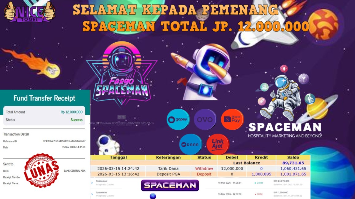 Selamat kepada User id : CXDF**** Telah berhasil mendapatkan kemenangan besar pada permainan SPACEMAN    Dengan kemenangan Sebesar Rp. 12.000.000,- Setelah mengisi formulir withdraw dengan kurung waktu hanya 5 – 10 menit pihak NICETOGEL sudah melakukan transfer kepada pemilik Userid dan dana sudah dapat di cairkan oleh pemenang. Bukti pembayaran yang kami berikan merupakan bukti pembayaran yang SAH / VALID yang langung di dapatkan melaui tanda transfer transaksi dari Bank yang di tuju.