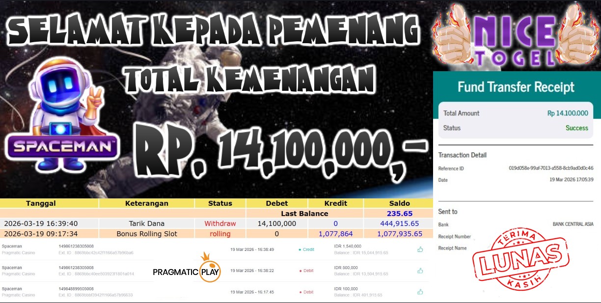 Selamat kepada User id : JAME**** Telah berhasil mendapatkan kemenangan besar pada permainan SLOT SPACEMAN Dengan kemenangan Sebesar Rp. 14.100.000,- Setelah mengisi formulir withdraw dengan kurung waktu hanya 5 – 10 menit pihak NICETOGEL sudah melakukan transfer kepada pemilik Userid dan dana sudah dapat di cairkan oleh pemenang. Bukti pembayaran yang kami berikan merupakan bukti pembayaran yang SAH / VALID yang langung di dapatkan melaui tanda transfer transaksi dari Bank yang di tuju.