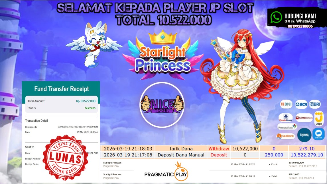 Selamat kepada User id : GUD**** Telah berhasil mendapatkan kemenangan besar pada permainan SLOT STARLIGHT PRINCESS   Dengan kemenangan Sebesar Rp. 10.522.000,- Setelah mengisi formulir withdraw dengan kurung waktu hanya 5 – 10 menit pihak NICETOGEL sudah melakukan transfer kepada pemilik Userid dan dana sudah dapat di cairkan oleh pemenang. Bukti pembayaran yang kami berikan merupakan bukti pembayaran yang SAH / VALID yang langung di dapatkan melaui tanda transfer transaksi dari Bank yang di tuju.
