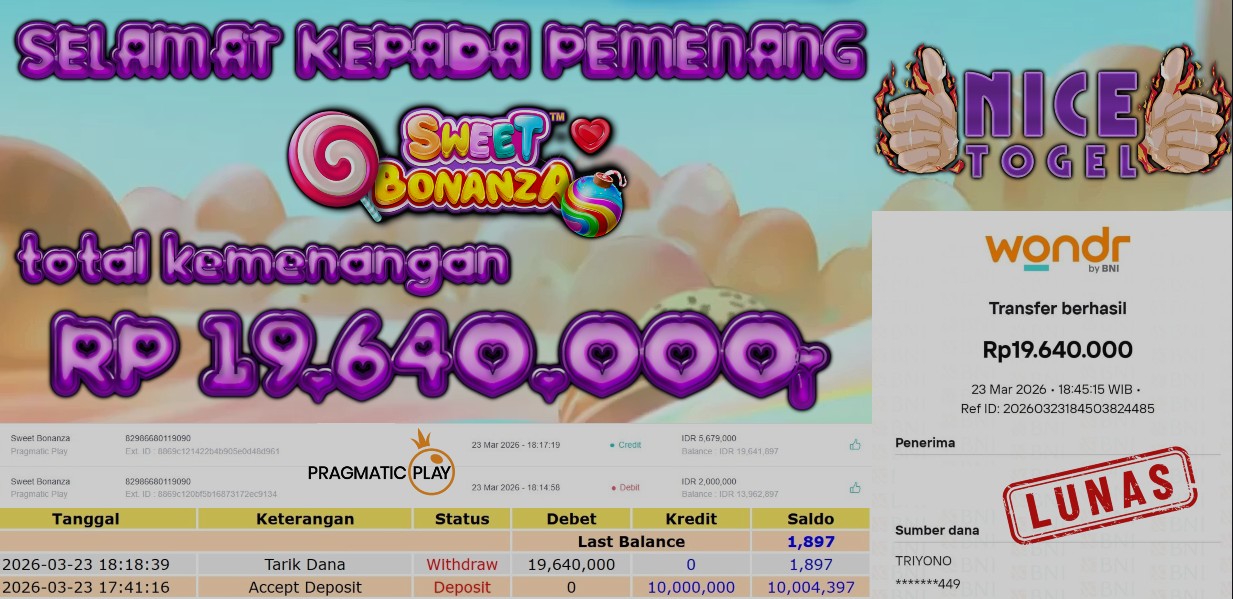 Selamat kepada User id : CVSF**** Telah berhasil mendapatkan kemenangan besar pada permainan SLOT SWEET BONANZA   Dengan kemenangan Sebesar Rp. 19.640.000,- Setelah mengisi formulir withdraw dengan kurung waktu hanya 5 – 10 menit pihak NICETOGEL sudah melakukan transfer kepada pemilik Userid dan dana sudah dapat di cairkan oleh pemenang. Bukti pembayaran yang kami berikan merupakan bukti pembayaran yang SAH / VALID yang langung di dapatkan melaui tanda transfer transaksi dari Bank yang di tuju.