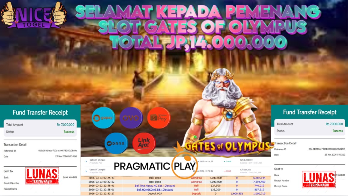 Selamat kepada User id : CVSF**** Telah berhasil mendapatkan kemenangan besar pada permainan SLOT GATES OF OLYMPUS Dengan kemenangan Sebesar Rp. 14.000.000,- Setelah mengisi formulir withdraw dengan kurung waktu hanya 5 – 10 menit pihak NICETOGEL sudah melakukan transfer kepada pemilik Userid dan dana sudah dapat di cairkan oleh pemenang. Bukti pembayaran yang kami berikan merupakan bukti pembayaran yang SAH / VALID yang langung di dapatkan melaui tanda transfer transaksi dari Bank yang di tuju.