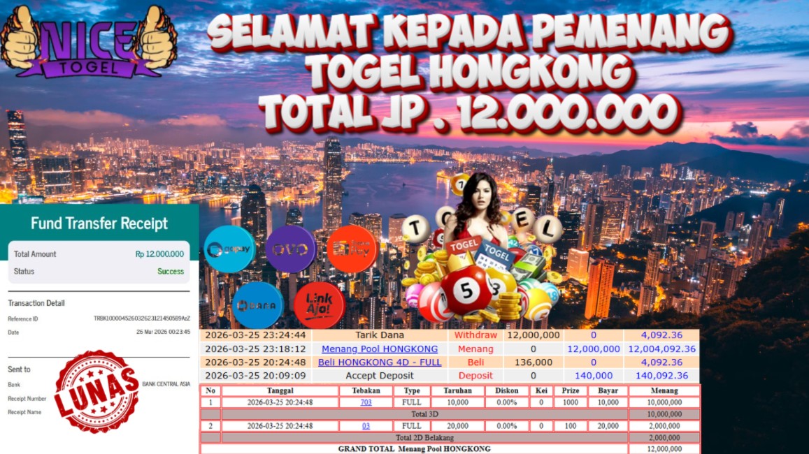 Selamat kepada User id : CBGD**** Telah berhasil mendapatkan kemenangan besar pada permainan TOGEL HONGKONG Dengan kemenangan Sebesar Rp. 12.000.000,- Setelah mengisi formulir withdraw dengan kurung waktu hanya 5 – 10 menit pihak NICETOGEL sudah melakukan transfer kepada pemilik Userid dan dana sudah dapat di cairkan oleh pemenang. Bukti pembayaran yang kami berikan merupakan bukti pembayaran yang SAH / VALID yang langung di dapatkan melaui tanda transfer transaksi dari Bank yang di tuju.